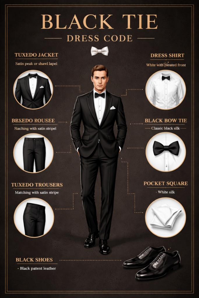 Black tie, jak název napovídá, znamená černá vázanka.Tento typ dress code je uveden především u příležitostí, jako jsou galavečery, státní bankety, premiéry a plesy.