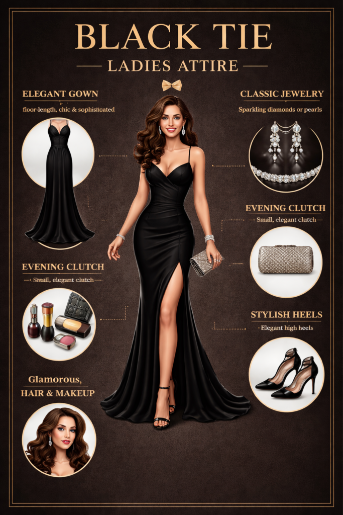 Pro dámy to byl dříve vyžadovány dlouhé černé šaty. Dnes je můžete nahradit i elegantními midi šaty do půli lýtek. I barevnost je volnější, takže dámy mohou zvolit tmavé odstíny barev šatů. Záleží na typu příležitosti, prostředí a na vašich preferencích, co se délky šatů týče.