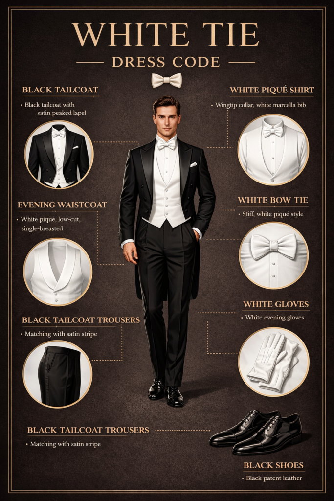 Pánský white tie je v černobílém provedení, hlavní roli v něm hraje frak. Měl by být jednořadý a vždy delší než vesta. Frak je doplněn kalhotami s vysokým pasem, které mohou mít na bocích sametové lampasy. V případě tohoto dress code zvolte vždy šle, ne pásek.